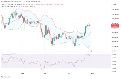 The cryptocurrency is currently hovering just below $95,000, showing signs of momentum and flashing caution signals. On the daily chart, Bitcoin is brushing against the upper Bollinger Band, a technical level often associated with overbought conditions. The upper band stands near $98,431; the lower support sits at $78,124, and the midline hovers around $88,278.