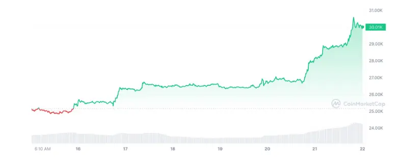 Amidst Bitcoin’s bull market, the mentioned above growth took place. As a matter of fact, it does look like a pump – for less than a day, Bitcoin increased in value by 8% and broke above $30k.