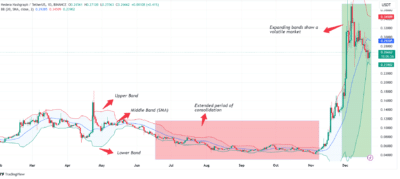Bollinger Bands, consisting of upper, middle, and lower bands, expand and contract with market volatility. Extended consolidation saw HBAR’s bands remain contracted from mid-May to late November, reflecting stagnation.